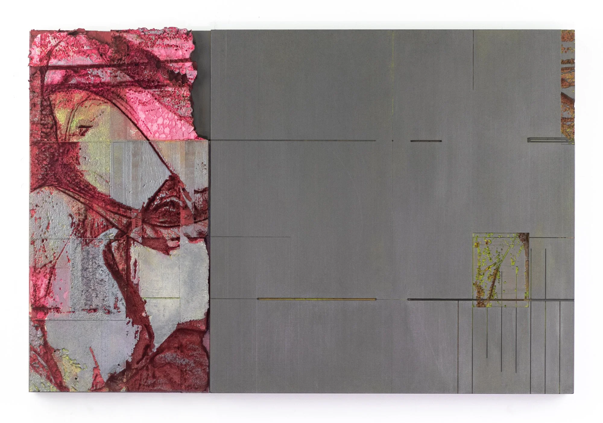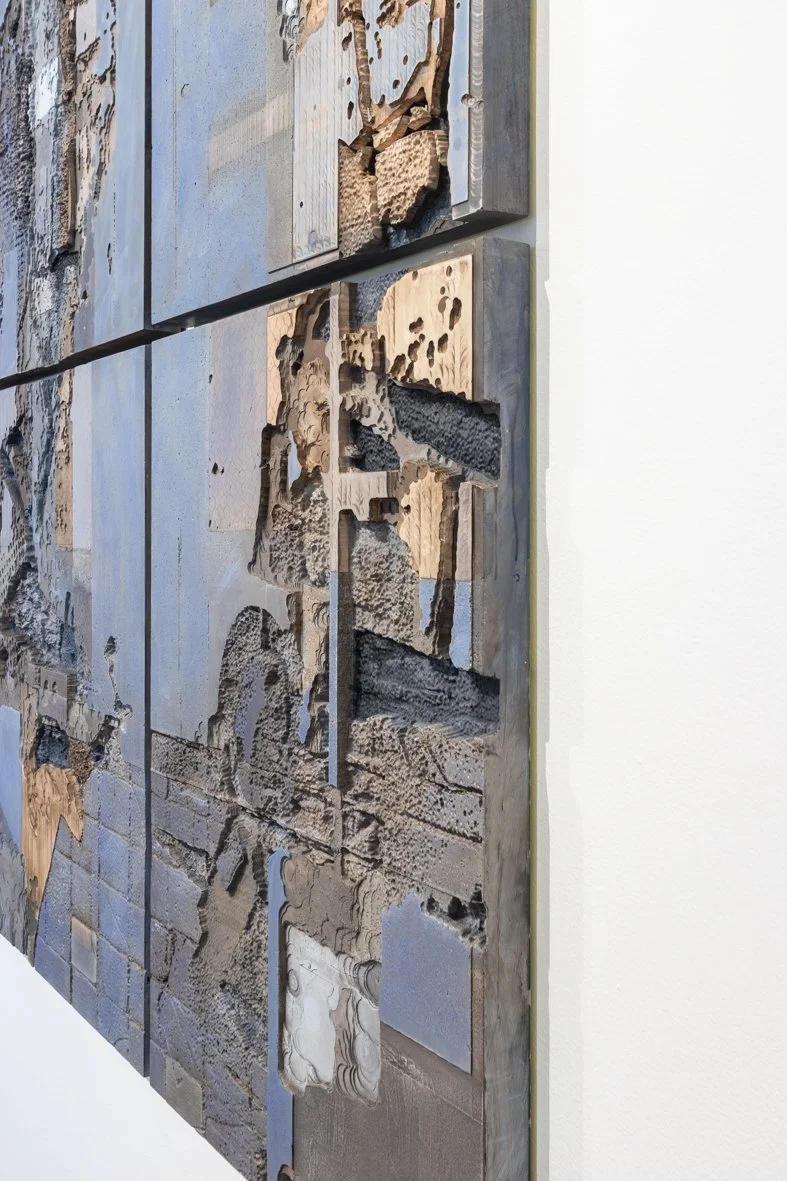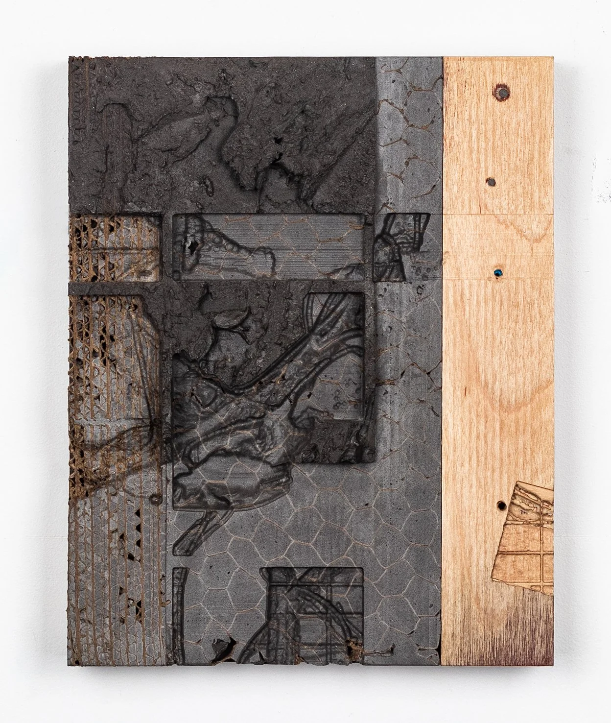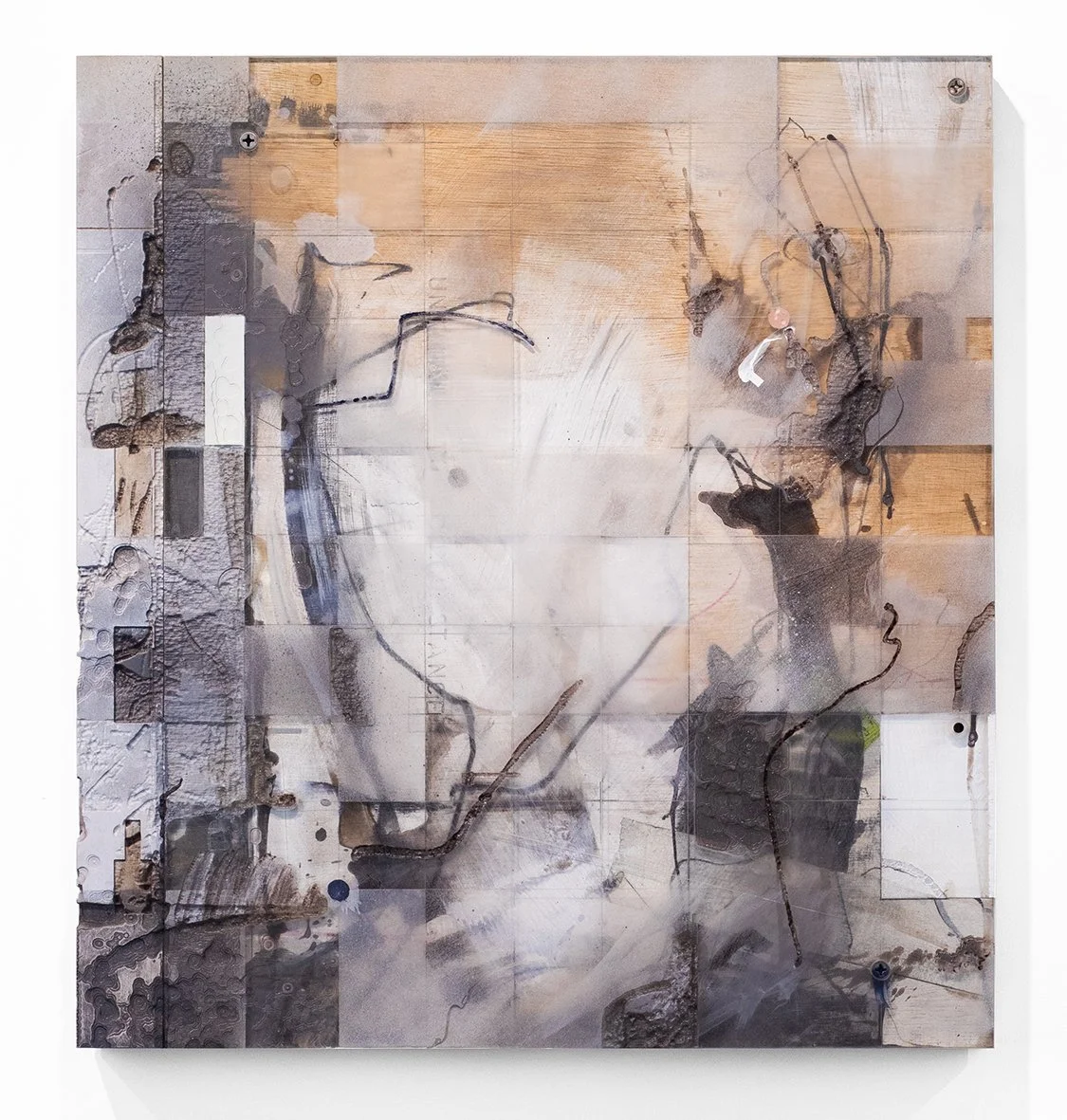 Gardiner’s creative processes are equally complex. Using a CNC machine (ie. Computer Numerical Control) he doesn’t simply make marks on a flat surface - he draws into the surface. Each drawing is an excavation that leaves a plane divided into layers, like a model of an archaeological site. The artist works back over these layered pieces, painting and shaping forms that hint at recognisable motifs, without ever reaching a conclusive final form.