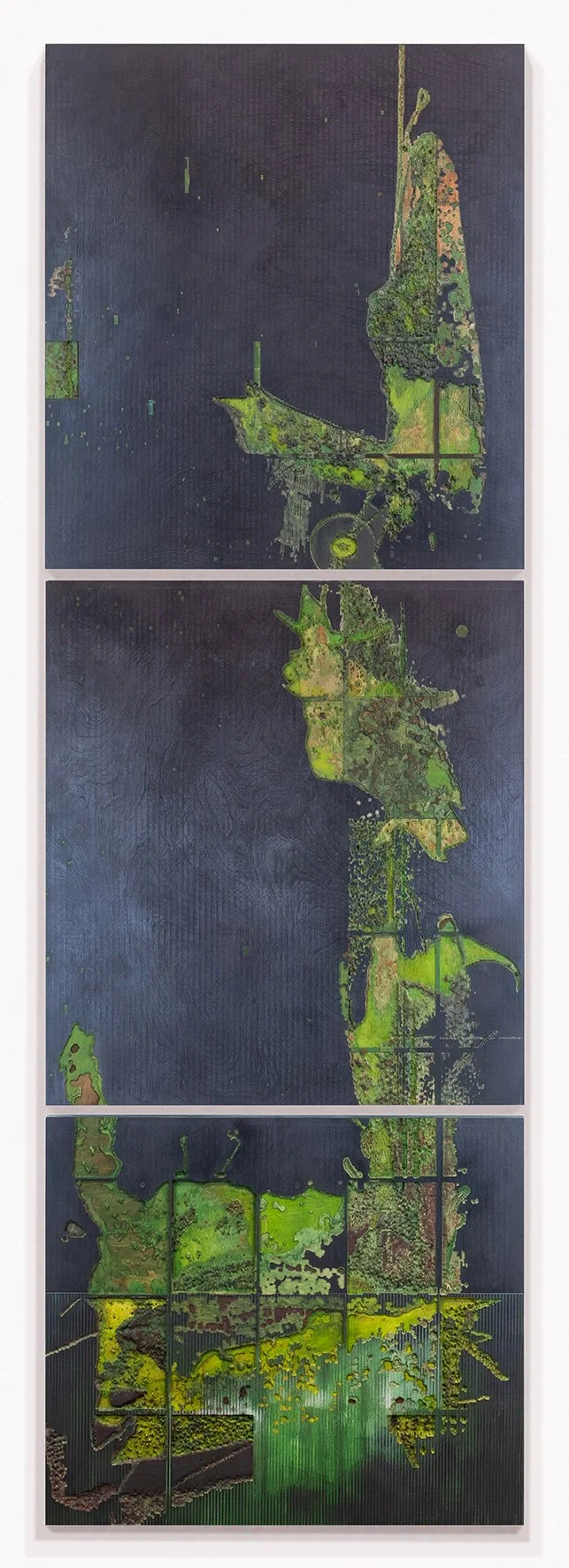 As maps, Gardiner’s works are ruined maps – to borrow the title of a 1967 philosophical crime novel by Kobe Abe. We look at these tableaux - composed of a bewildering variety of materials, carved by machine and finished by hand - and see sharply defined spaces that have been routinely broken or overrun. Gardiner the architect and inventor may be accustomed to precise calculation, but Gardiner the artist practices a style of drawing that refuses to conform to all those grids and straight lines.