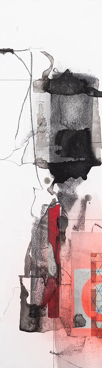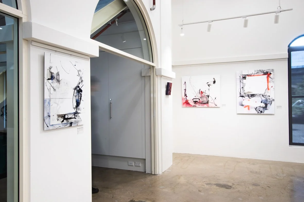 The Sentience series is based on automatic drawing techniques developed over decades of practice, first as moving single line drawings made on public transport, then later developed for the conscious series of paintings based on sketch book single line drawings.